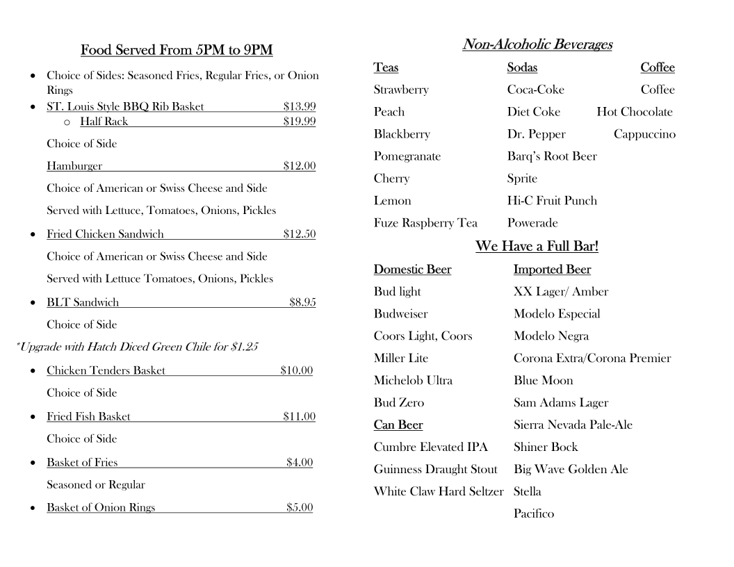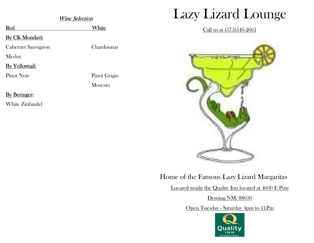 Welcome to Lazy Lizard Bar & Grill, nestled inside the Quality Inn in Deming, NM. This inviting eatery is a delight for travelers and locals alike, serving up an array of mouthwatering dishes from 5 PM to 9 PM. Highlights of the menu include the satisfying ST. Louis Style BBQ Rib Basket for just $14.99, and the perfectly crafted Fried Chicken Sandwich, both available with a choice of sides like seasoned fries or onion rings.